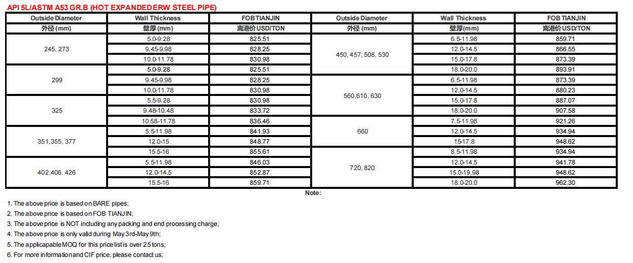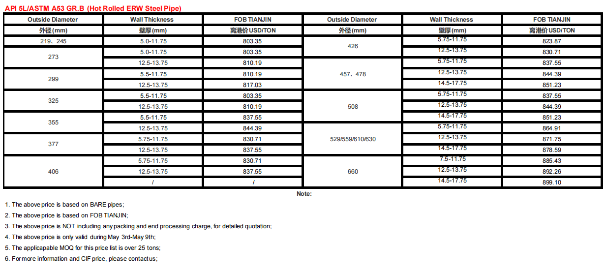 API 5L/ASTM A106 GR.B, Senarai Harga Paip Keluli Karbon ERW 3 Mei-9 Mei 2021