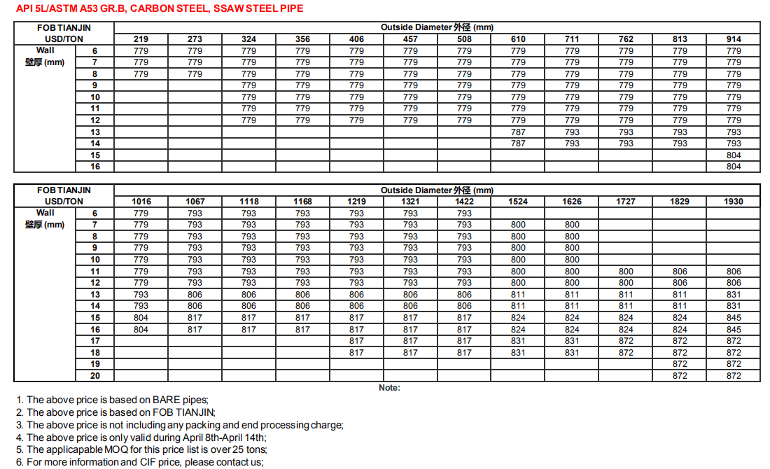 API 5L/ASTM A53 GR.B, SSAW Carbon Steel Pipe Price List April 8th-April 14th, 2021